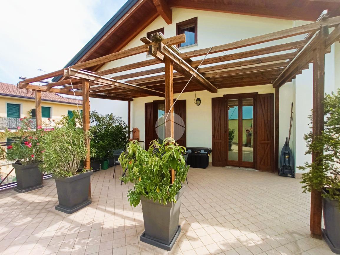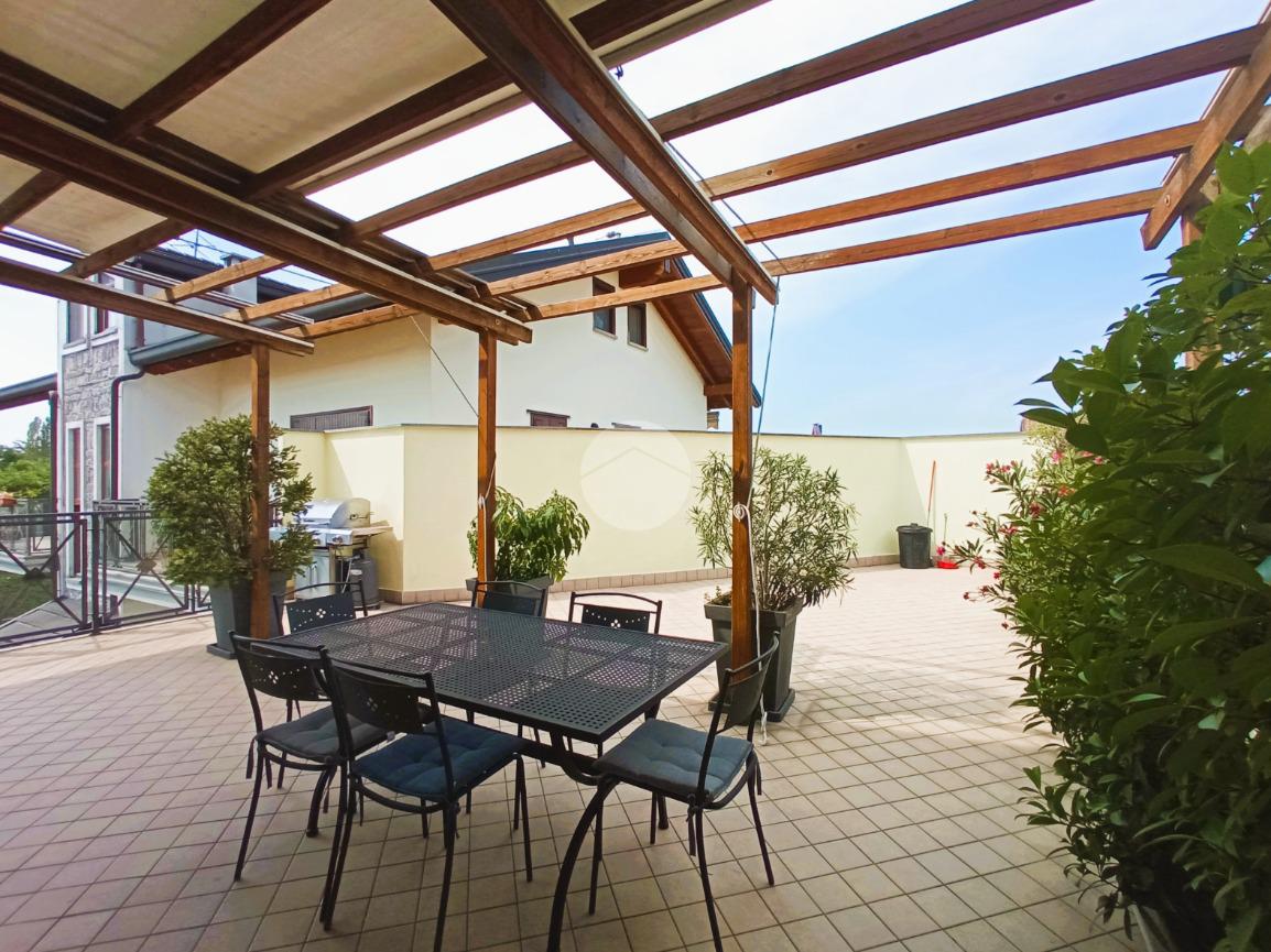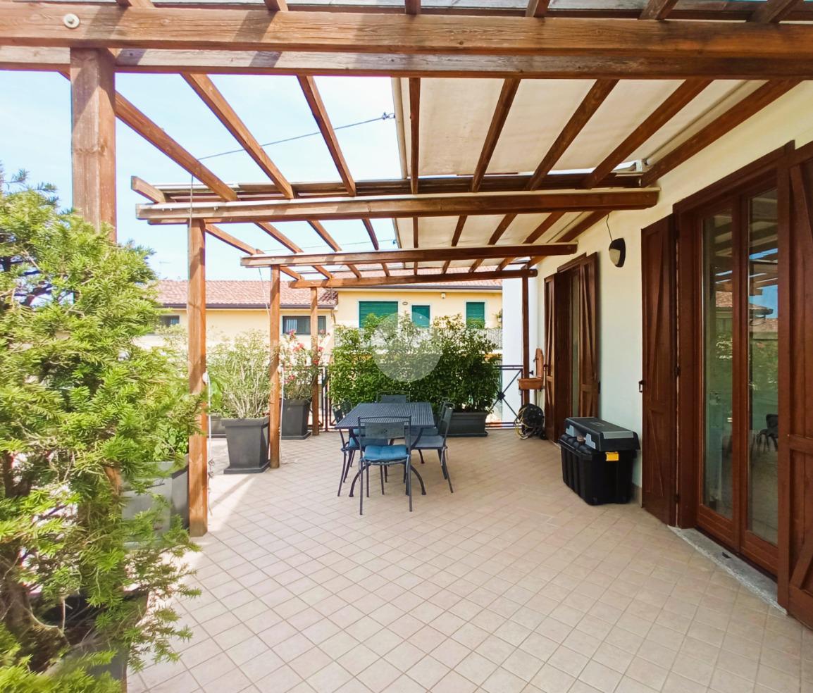 Il vero valore aggiunto dell'abitazione è il grande terrazzo privato, parzialmente coperto da un pergolato strutturale. Questo spazio esterno rappresenta una naturale estensione della zona giorno, ideale per il relax all'aperto e per ospitare zone pranzo esterne.