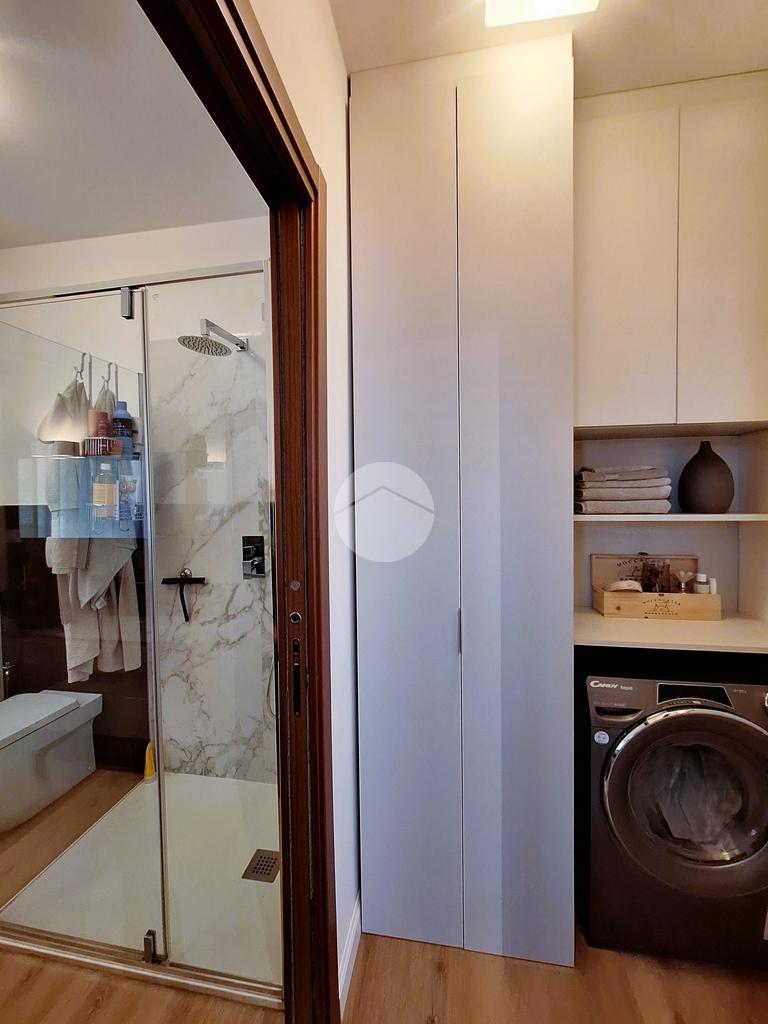 Il disimpegno è stato trasformato in una lavanderia a scomparsa d’eccellenza, grazie a un’armadiatura su misura che ottimizza gli spazi con eleganza; il bagno è finestrato con box doccia.